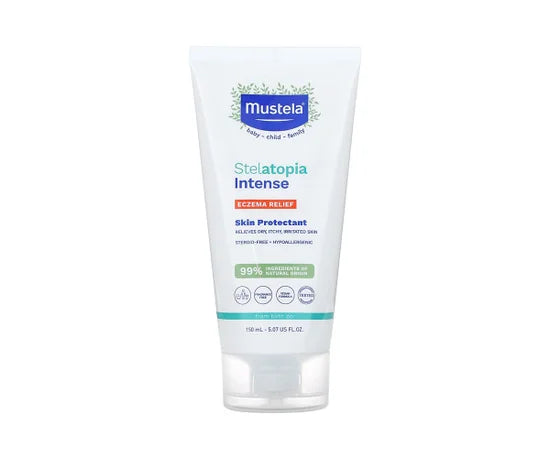 Mustela Stelatopia Intense Eczema Relief (150 ml) is a gentle, fragrance-free skin protectant that soothes itching, irritation, and dryness caused by eczema. Formulated with 99% natural ingredients, it provides up to 24 hours of hydration and is safe for the whole family, including newborns.